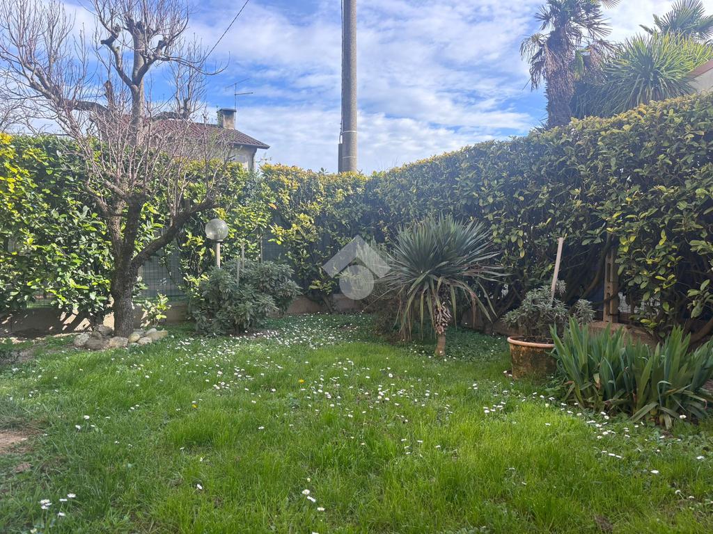 Brugine: In località Campagnola, appartamento al piano terra in contesto di sole due unità con giardino esclusivo. L'ingresso conduce nella cucina abitabile separata dall'ampio soggiorno. Il corridoio porta al reparto notte dove vi sono tre camere di cui due matrimoniali e due bagni finestrati uno con doccia e il secondo con la vasca. No garage ma possibilità di creare una pompeiana nell'ampio giardino.